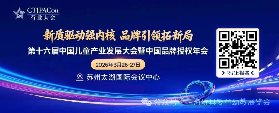 2026年3月26日-27日,由中国玩具和婴童用品协会主办的(以下简称”中国玩协“)第十六届中国儿童产业发展大会暨中国品牌授权年会(以下简称“行业大会”),将在苏州太湖国际会议中心举办。本届大会以“新质驱动强内核·品牌引领拓新局”为主题,洞察趋势、思维碰撞、合作对接、拓展人脉四大维度,为行业发展赋能,共探高质量发展新路径,共绘创新升级新蓝图。活 动 亮 点